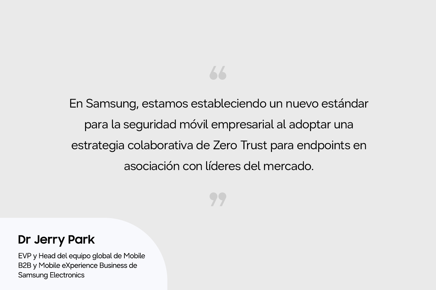 Es por eso que Samsung está trabajando con empresas líderes del mercado para brindar soluciones de seguridad que funcionen perfectamente con la infraestructura existente, ofreciendo una verdadera protección de extremo a extremo. Estas soluciones colaborativas son un testimonio de nuestro compromiso no solo de adherirnos a los estándares de la industria, sino también de impulsar su desarrollo continuo en lo que respecta a la seguridad de endpoints bajo el modelo de Zero Trust. Esto es apenas el comienzo.