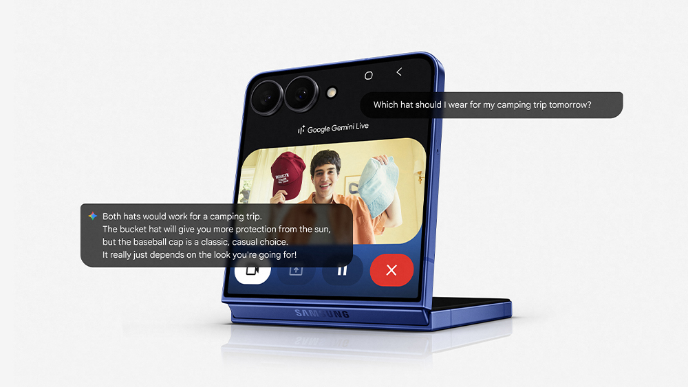 - Gemini Live[11] ahora está disponible directamente en la FlexWindow, permitiéndote usar la voz para buscar información y ejecutar tareas sin usar las manos. Si estás preparando un viaje al extranjero, solo decile a Gemini lo que necesitas: puede mostrar los detalles del vuelo desde Samsung Wallet, configurar un recordatorio para salir al aeropuerto e incluso encontrar restaurantes mejor calificados en tu destino, y posteriormente guardar toda la información en Samsung Notes para un acceso fácil. Es como tener un asistente personal en la pantalla de portada.