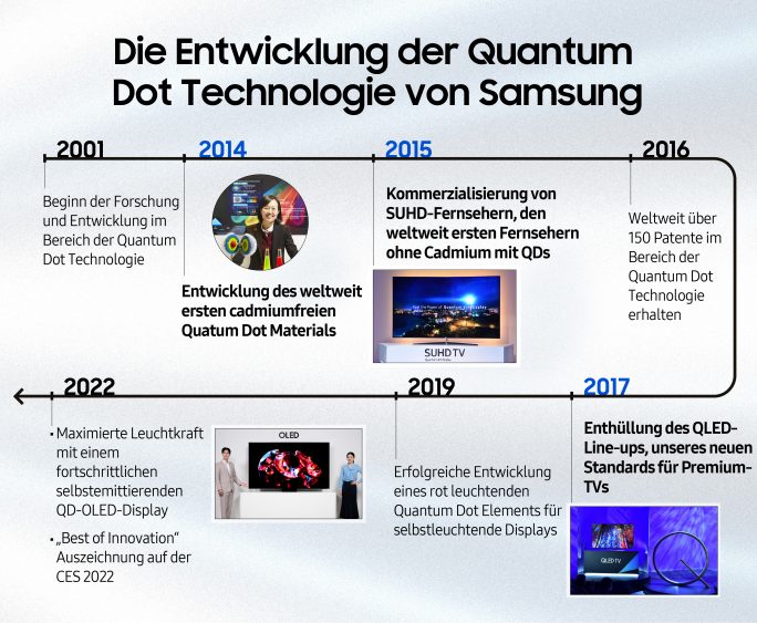 Bereits 2001 begann das Unternehmen mit der Forschung. Um lebendige Farben zu erzielen, mussten die winzigen Partikel gleichmäßig verteilt sein – was bei der kommerziellen Herstellung von Displays lange eine bestehende Herausforderung war. 2014 gelang es Samsung, ein cadmiumfreies Nanokristall-Material zu entwickeln. 2015 folgten die weltweit ersten SUHD-Fernseher, und Samsung hatte über 150 Patente angemeldet. Samsung stellte 2017 seine QLED-Serie vor und setzte damit eine echte Alternative zu OLED-Modellen, auch bei Premium-TVs. Durch den Einsatz von Metall Quantum Dots erreichte Samsung den DCI-P3-Farbstandard und erstmalig 100 % Farbvolumen – für eine überzeugende Farbdarstellung, die vor Burn-in4 schützten kann und dadurch die Langlebigkeit der Displays verbessern kann.