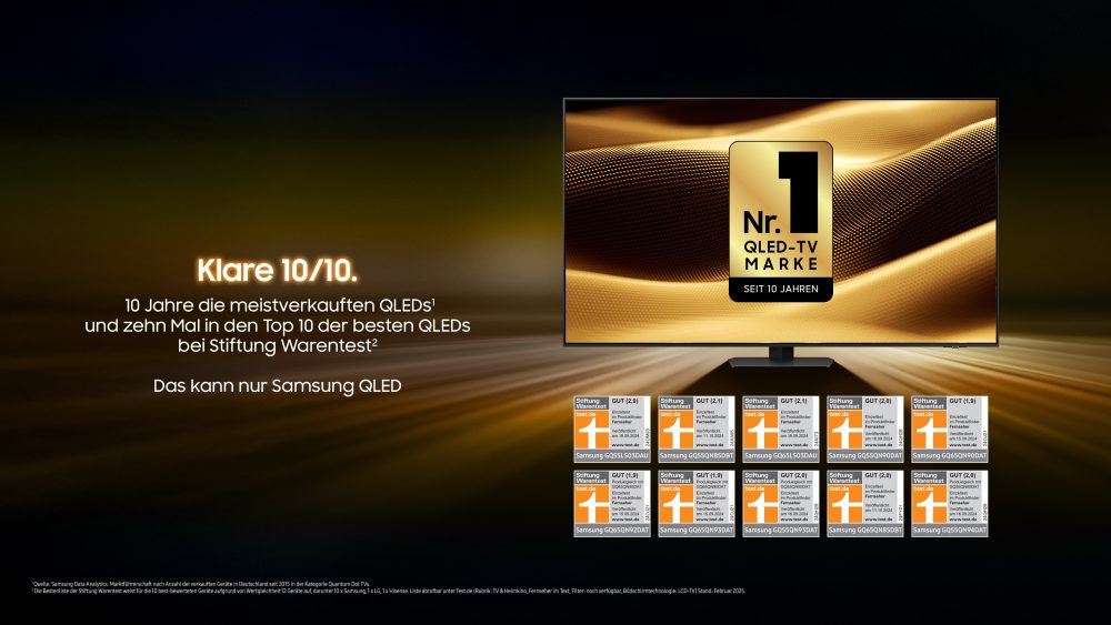 3 Die Bestenliste der Stiftung Warentest weist für die 10 best-bewerteten Geräte aufgrund von Wertgleichheit 12 Geräte auf, darunter 10 x Samsung, 1 x LG, 1 x Hisense. Liste abrufbar unter Test.de (Rubrik: TV & Heimkino, Fernseher im Text, Filter: noch verfügbar, Bildschirmtechnologie: Bildschirmtechnologie: LCD-TV) Stand: Februar 2025