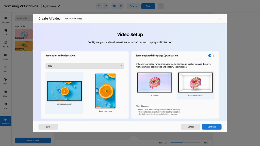 Samsung VXT’s AI Studio app transforms static images into signage-ready video. User can also optimise the content — created through VXT’s AI Studio — for Spatial Signage.