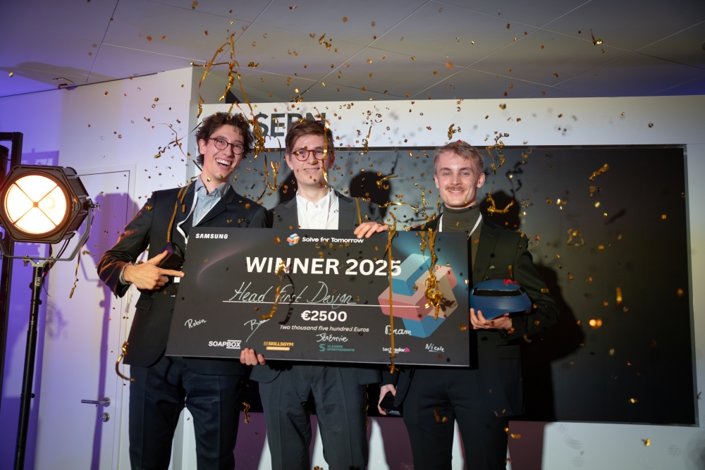 La semaine dernière, dix équipes ont atteint la finale et ont pu présenter leur idée à un jury composé de cinq membres. Qu’il s’agisse de capteurs intelligents mesurant la qualité de l’air, d’applications food saines ou d’une raquette de padel durable, les étudiants se sont révélés de véritables champions du pitch lors de la finale. Le jury, composé de Nicole Rosanella (Director Corporate Marketing chez Samsung Electronics Benelux), Bram Doolaege (Lead Trainer en Expert chez SkillsGym), Bram Lodewijks (rédacteur en chef de TechRadar Benelux), Jérémie Deroo (coordinateur de la Fédération flamande des sports) et Robin Seager (Director of Operations chez Soapbox), a désigné l’équipe Head First Design comme vainqueur de Solve For Tomoworw Benelux 2025 après mûre réflexion. Head First Design a proposé un prototype de casque pour vélo électrique qui améliore la perception spatiale et le temps de réaction du cycliste.