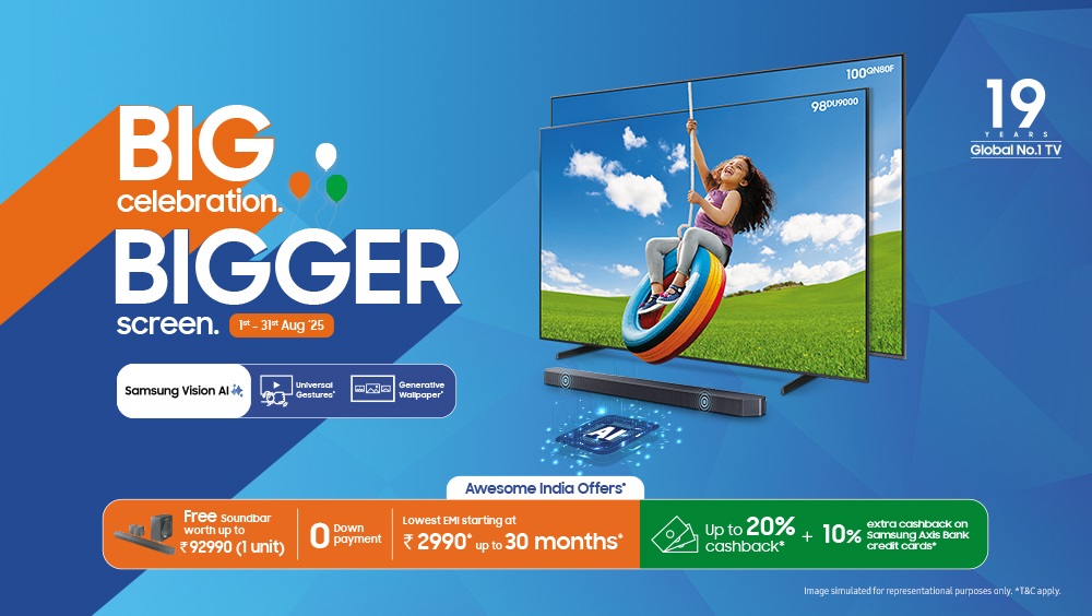 सैमसंग ने भारत में स्वतंत्रता दिवस के अवसर पर विजन एआई टीवी पर ‘बिग सेलीब्रेशन, बिगर स्क्रीन’ ब्लॉकबस्टर डील्स की घोषणा की