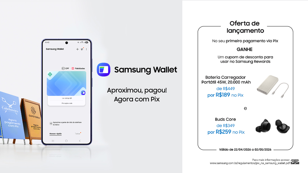 Para celebrar a chegada do Pix à Samsung Wallet, os usuários que fizerem uma transação de qualquer valor utilizando a funcionalidade durante o período inicial de lançamento – de 22 de abril a 02 de maio de 2026 – receberão um cupom exclusivo para adquirir produtos com desconto no programa Samsung Rewards.
