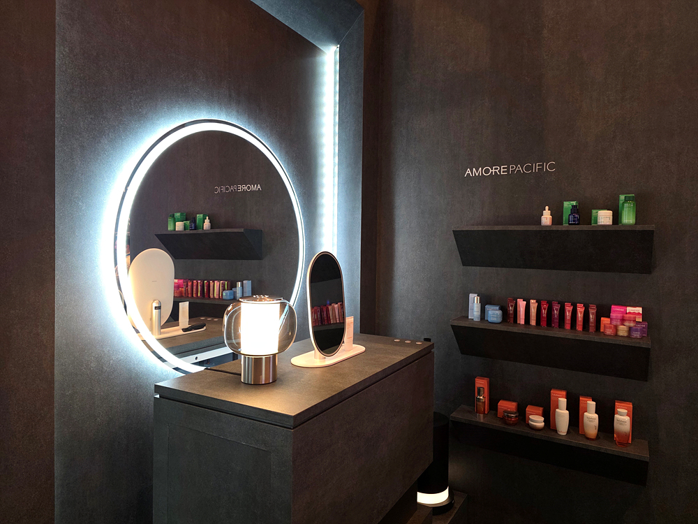Na área seguinte, os visitantes entraram em um espaço modelado como um camarim, onde um espelho circular se revelou como o AI Beauty Mirror1. Impulsionada por AI no dispositivo (on-device AI), a tecnologia sinalizou a expansão da Samsung para o setor de beleza.