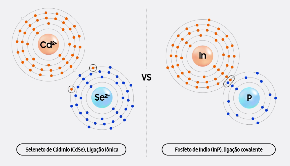 Comparação de pontos quânticos à base de cádmio com ligações iônicas e pontos quânticos à base de índio com ligações covalentes.