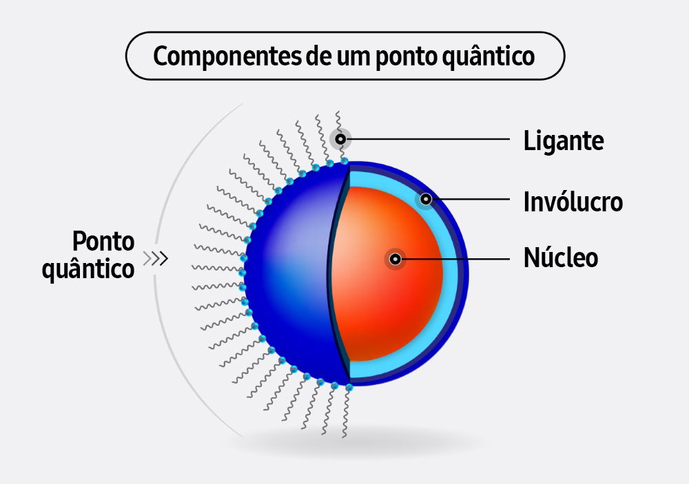 Os pontos quânticos encontrados nas QLEDs da Samsung são compostos por três componentes principais: um núcleo, onde a luz é emitida; um invólucro, que protege o núcleo e estabiliza sua estrutura; e um ligante, um revestimento de polímero que aumenta a estabilidade da oxidação fora do invólucro. A essência da tecnologia de pontos quânticos está na integração perfeita desses três elementos, um processo industrial avançado que abrange desde a aquisição e síntese de materiais até a produção em massa e o registro de várias patentes.