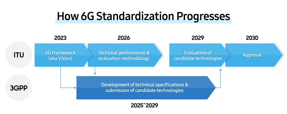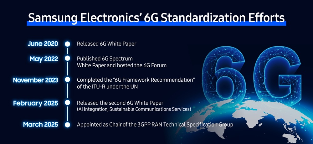 Desde 2020, a Samsung Electronics tem desempenhado um papel pioneiro no avanço das tecnologias de comunicação de próxima geração por meio da participação ativa em esforços internacionais de padronização. Isso inclui a publicação de seus white papers sobre 6G e a conquista de posições-chave em grandes organizações, como o Projeto de Parceria de 3ª Geração (3GPP). Nas eleições do 3GPP de maio de 2025, a Samsung garantiu novas posições de liderança, reafirmando sua posição distinta na vanguarda do setor.