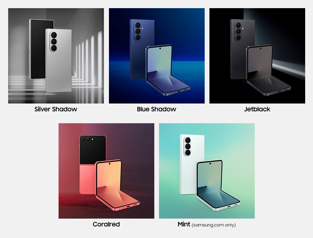As cores globais do Galaxy Z Flip7. A cor Coral não está disponível no Brasil. Esta imagem de fundo foi criada por AI generativa | Imagem meramente ilustrativa