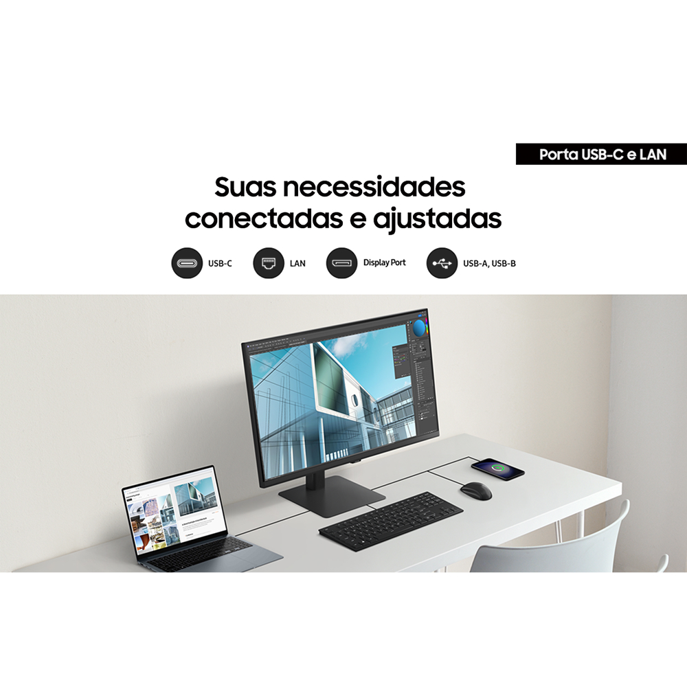 Contribuindo para ainda mais possibilidades, tudo se mantêm conectado para otimizar o espaço de trabalho. Isso porque o ViewFinity S8 chega com uma entrada USB-C, que permite o carregamento de 90 W e transferência de dados, e uma entrada LAN integrada, para conectividade Ethernet perfeita para notebooks.