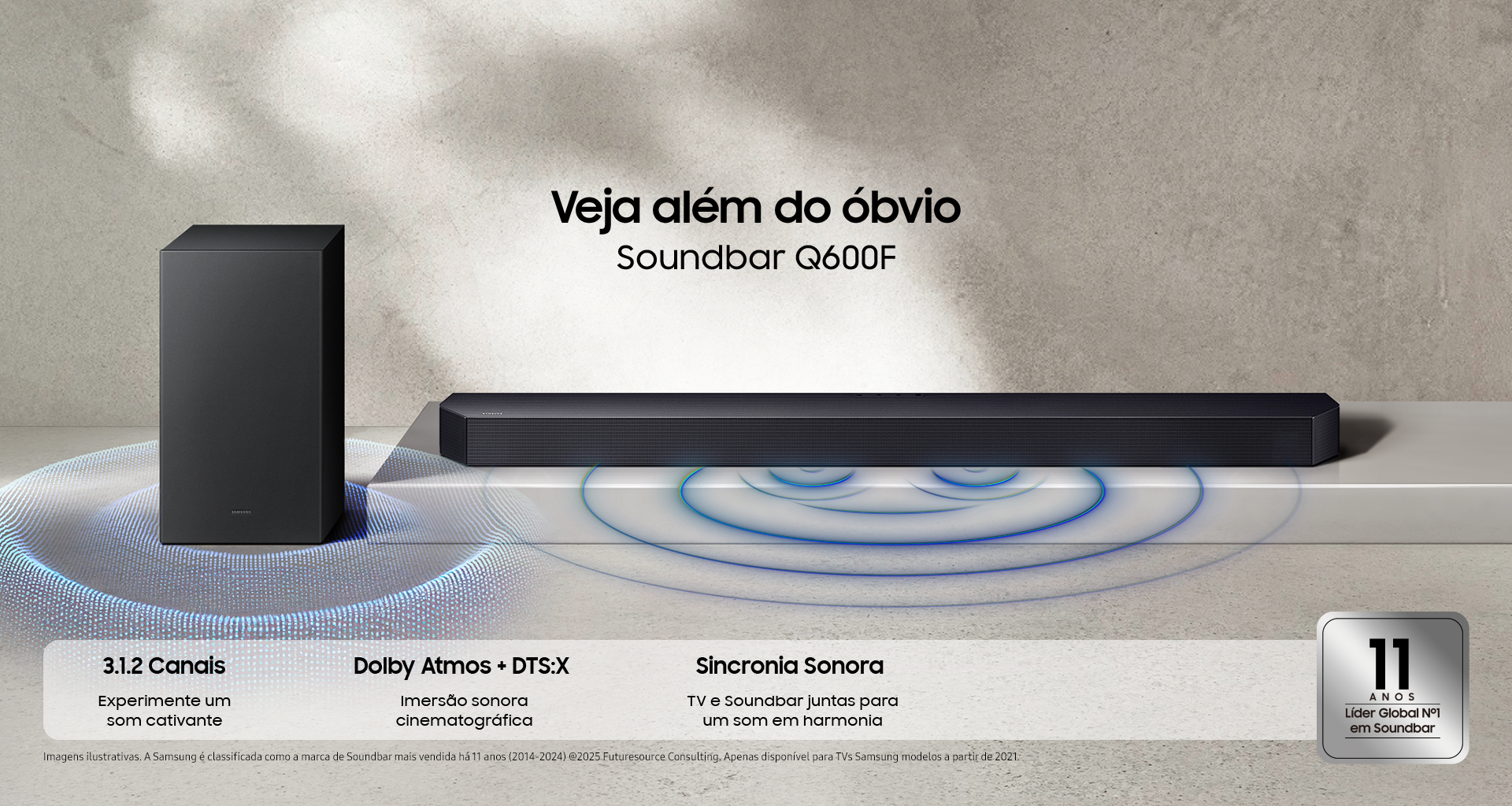 1 A Samsung é classificada como a marca de Soundbar mais vendida há 11 anos (2014-2024)©2025 Futuresource Consulting.
