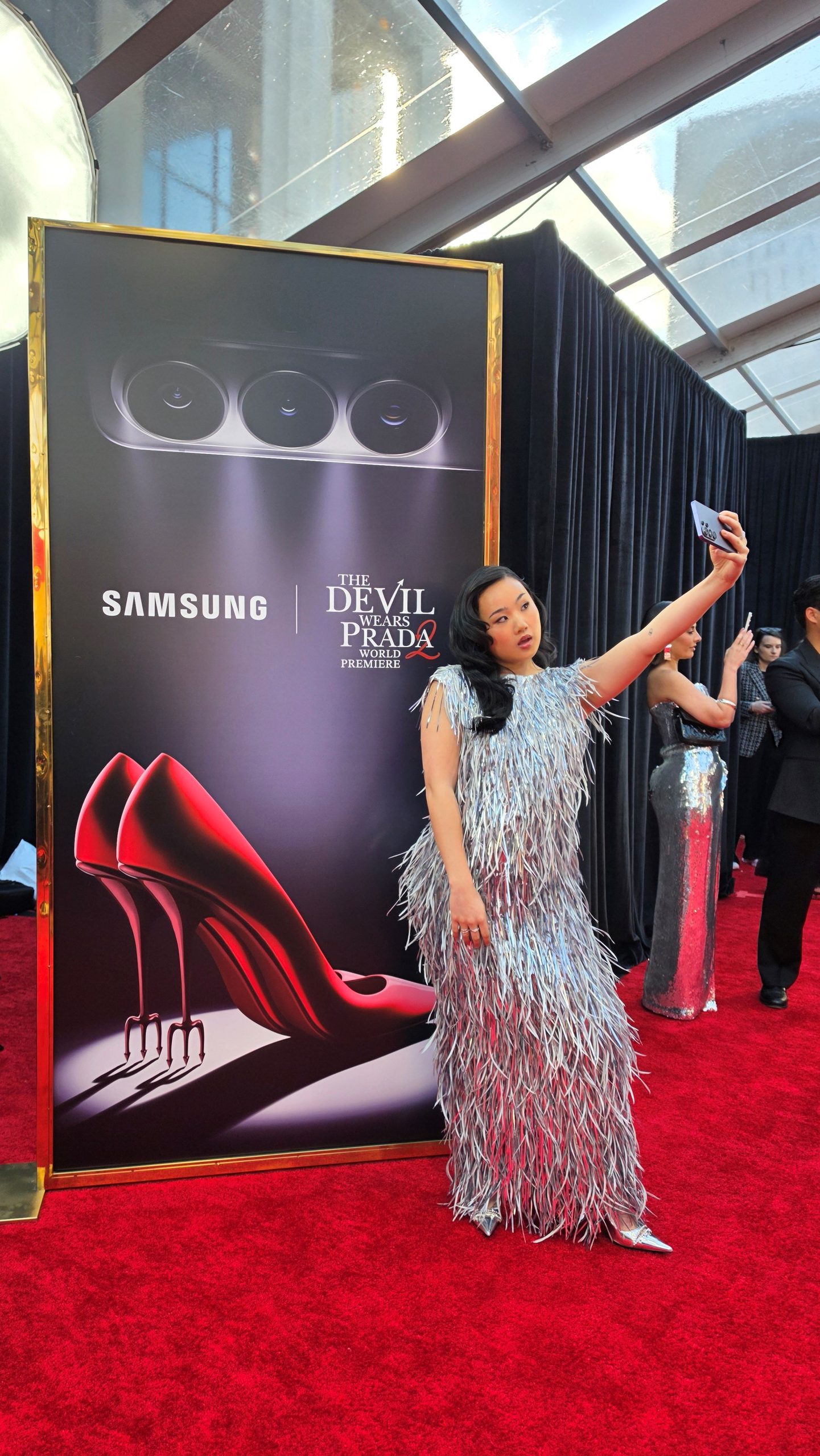 Helen J. Shen tira uma selfie no tapete vermelho usando o Galaxy S26 Ultra