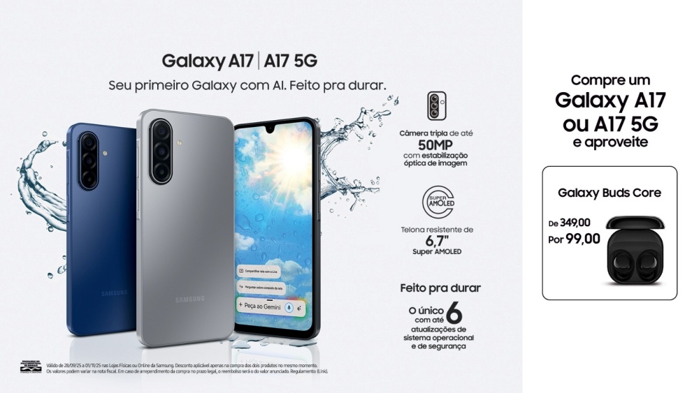 A Samsung preparou uma ação especial de lançamento para aproveitar a chegada do novo Galaxy Buds Core. Na compra de um Galaxy A17 (versão 5G ou LTE) entre os dias 28 de setembro de 2025 e 01 de novembro de 2025, o fone de ouvido pode ser adquirido4 por R$ 99,00. A ação é válida nas lojas físicas e Online da Samsung. Consulte o regulamento completo neste link.