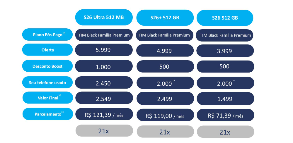 Ao adquirir um Galaxy S26, Galaxy S26+ ou Galaxy S26 Ultra de 512 GB de armazenamento entre 25 de fevereiro e 29 de março de 2026, o consumidor paga o valor do Galaxy S26, Galaxy S26+ e Galaxy S26 Ultra de 256 GB, recebendo, assim, o dobro de memória interna.