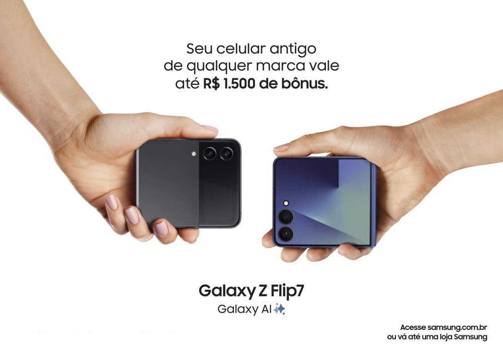 Para o lançamento do novo Galaxy Z Flip7, de 24 de julho a 24 de agosto de 2025, o seu dispositivo antigo vale até R$ 1.500,00 na compra29 de um Galaxy Z Flip7 pelo Troca Smart Samsung. Para mais informações, visite samsung.com/br/trade-in.