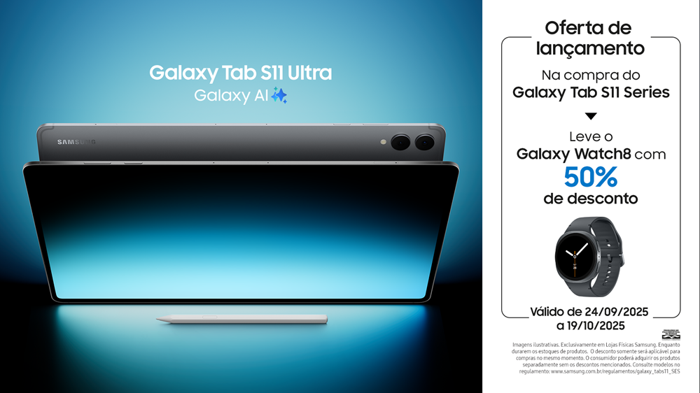 No período de 24 de setembro até o dia 19 de outubro, os consumidores ainda podem aproveitar a promoção de lançamento24 da série Galaxy Tab S11. Durante este período, nas lojas participantes, na compra de qualquer um novos Galaxy Tab S11, o consumidor pode levar junto um Galaxy Watch8 com até 50% de desconto nas lojas físicas e até 30% na loja online da Samsung, além de resgatar os descontos de Pré Registros caso tenham efetuado o cadastro.