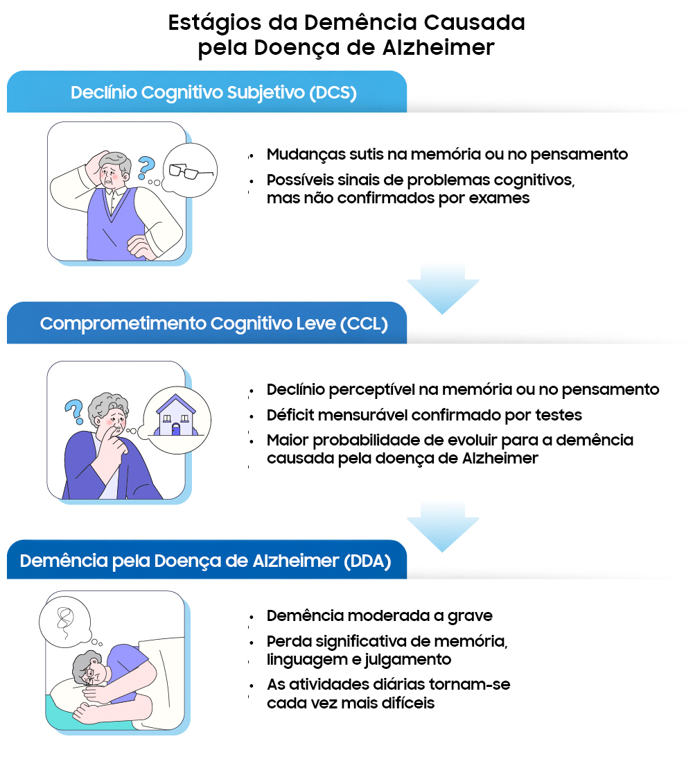 O comprometimento cognitivo leve (CCL), muitas vezes considerado um estágio precursor da demência, é motivo particular de atenção. Testes clínicos revelam declínio cognitivo mensurável em pessoas com CCL, embora elas ainda sejam capazes de realizar atividades cotidianas. Segundo estudos citados pela Alzheimer’s Association, cerca de 12% a 18% das pessoas com 60 anos ou mais vivem com CCL, e 10% a 15% delas progridem para demência a cada ano. Como resultado, a detecção precoce e o gerenciamento do CCL tornaram-se uma prioridade crescente para a comunidade médica1,2.