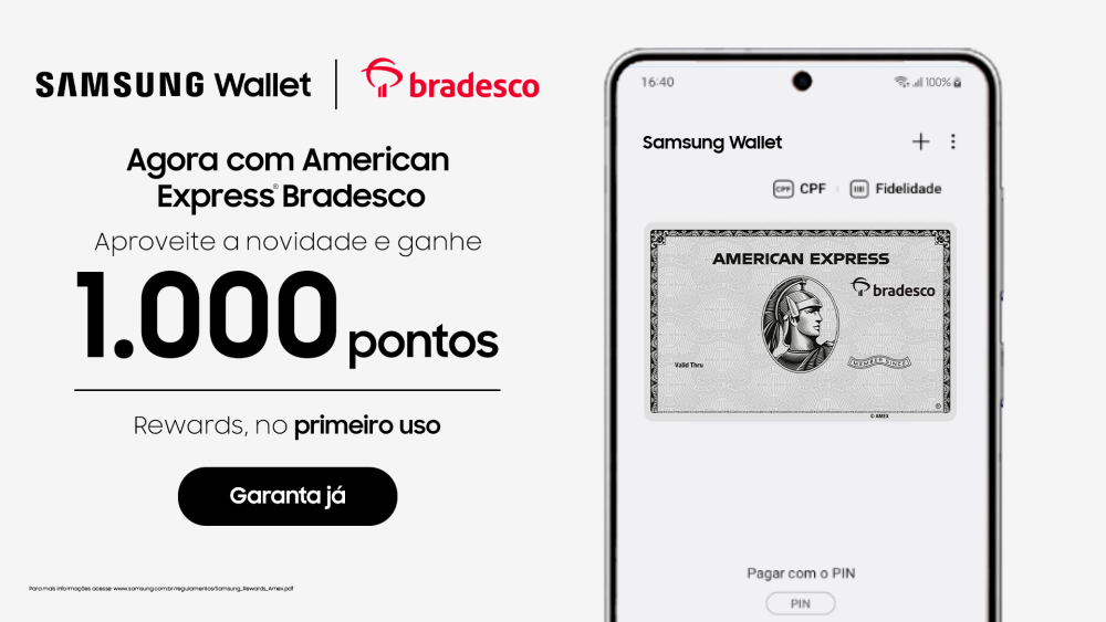 Para o celebrar a chegada do American Express Bradesco à plataforma Samsung Wallet, os usuários que cadastrarem o cartão e realizarem uma compra por aproximação recebem 1.000 pontos para utilizar no Samsung Rewards.
