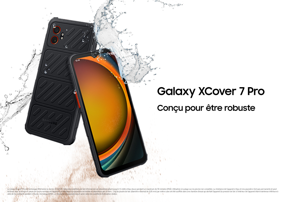 [7] Le Galaxy XCover7 Pro, la Galaxy Tab Active5 Pro ainsi que le stylet S Pen groupé de la Tab Active5 Pro sont résistants à l’eau et à la poussière avec une cote IP68. Selon les conditions d’essais internes en laboratoire : la résistance à la poussière a été testée à l’aide d’un test de pénétration de la poussière avec des particules inférieures à 50 μm × 70 μm dans une chambre antipoussière; et la résistance à l’immersion a été testée dans jusqu’à 1,5 mètre d’eau douce pendant jusqu’à 30 minutes. Rincez les résidus et séchez après avoir mouillé l’appareil. Utilisation à la plage ou à la piscine non conseillée. La résistance à l’eau et à la poussière du S Pen n’est pas permanente et peut diminuer avec le temps en raison de l’usure normale. Retirez tout excès d’eau du stylet S Pen avec un chiffon sec ou une serviette avant de l’utiliser ou de le fixer à la tablette.