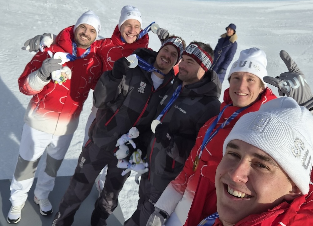 Goldmedaillengewinner Franjo von Allmen und Tanguy Nef vom Team Schweiz und die Silbermedaillengewinner Marco Odermatt und Loïc Meilla ebenfalls vom Team Schweiz, die sich den zweiten Platz mit Vincent Kriechmayr und Manuel Feller vom Team Österreich teilen. (Foto: Franjo von Allmen)
