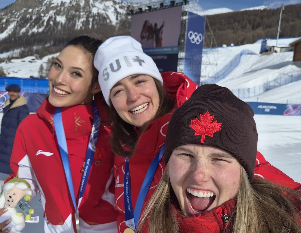 Goldmedaillengewinnerin Mathilde Gremaud vom Team Schweiz, Silbermedaillengewinnerin Eileen Gu vom Team China und Bronzemedaillengewinnerin Megan Oldham vom Team Kanada. (Foto: Megan Oldham)