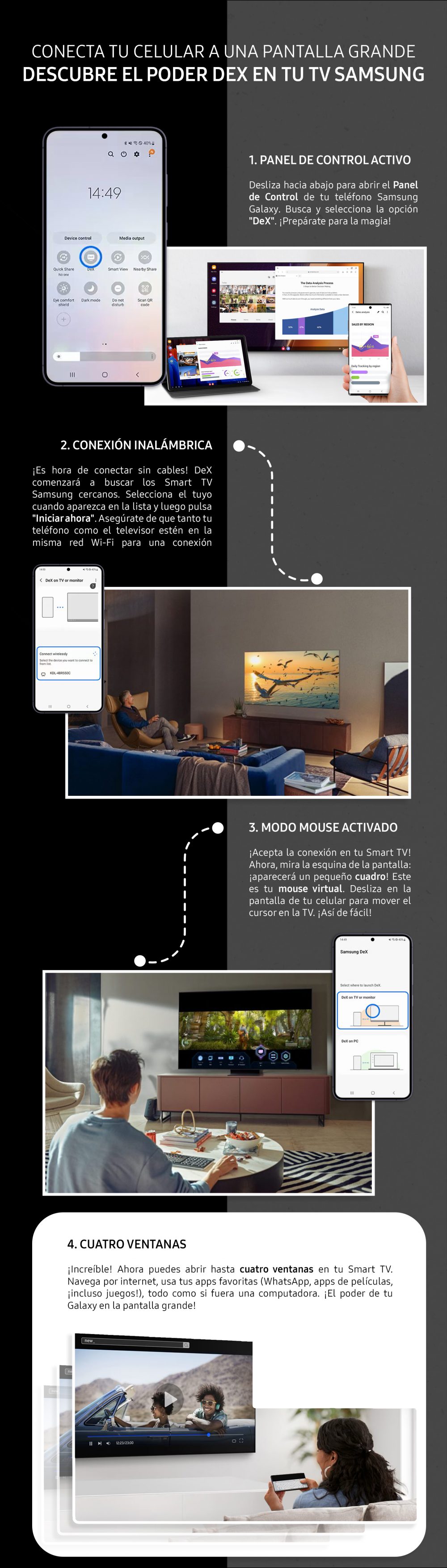 ¿Curioso por experimentar esta innovadora forma de controlar tu televisor? Mira la infografía para que tengas una guía visual paso a paso para conectar tu teléfono Galaxy a tu TV Samsung y utilizarlo como un práctico mouse y teclado inalámbrico. Descubre lo fácil que es navegar por tus aplicaciones, buscar videos y controlar la reproducción con la comodidad de tu smartphone, siguiendo las sencillas instrucciones que te mostramos a continuación.