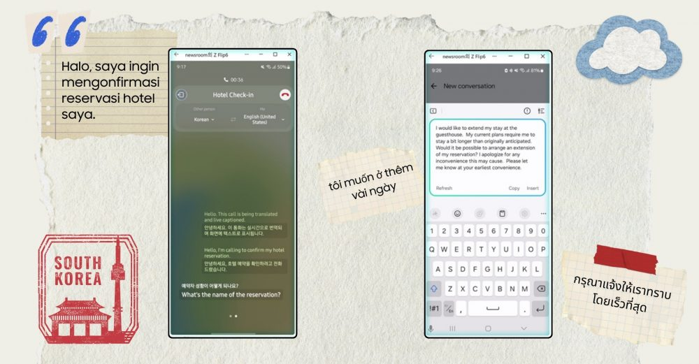 Ahora imagina que acabas de llegar a Corea y necesitas confirmar tu estancia en un hotel. Estás a punto de hacer una llamada, pero la barrera del idioma hace que esta simple pregunta parezca abrumadora. Live Translate es tu arma secreta. Integrado en tu dispositivo Galaxy, permite la traducción de audio en tiempo real con tu interlocutor, acompañada de una transcripción en pantalla, para una comunicación fluida. Con soporte para un total de 30 idiomas y dialectos, Live Translate te permite disfrutar de conversaciones fluidas mientras exploras.