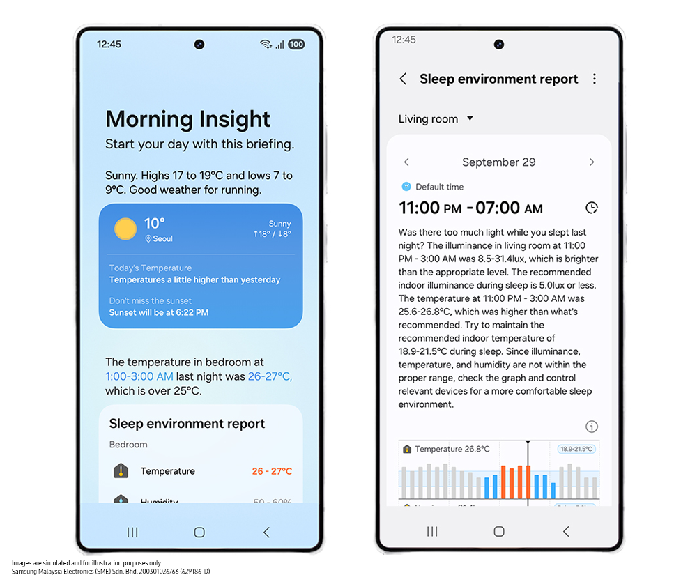 Personalizar tus condiciones de sueño no termina ahí. Los informes del entorno de sueño de la app Samsung Health ofrecen información detallada sobre factores clave, como la temperatura, la humedad, el dióxido de carbono y la iluminación, a través de dispositivos y sensores conectados. Al conectarlos a tus dispositivos Galaxy, otros electrodomésticos, como los aires acondicionados Samsung, se combinan para garantizar un sueño placentero mediante el ajuste de la temperatura con el modo “Good Sleep”, que encuentra la temperatura óptima en cada etapa del sueño para un entorno de sueño excepcional que se adapta a todas tus necesidades.