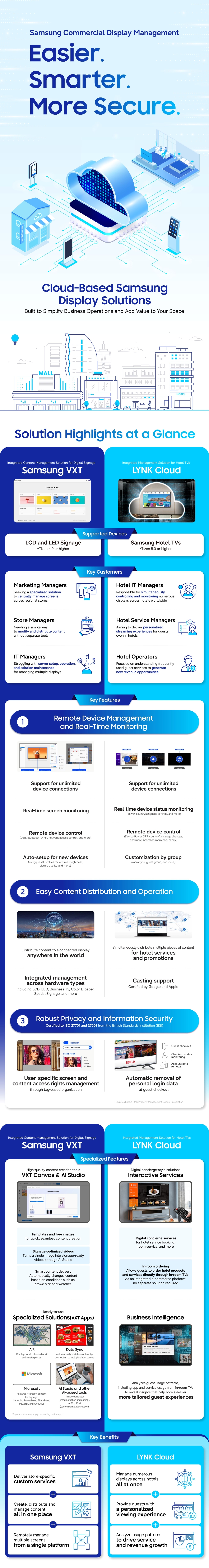 Revisa la siguiente infografía para conocer funciones y beneficios adicionales de Samsung VXT y LYNK Cloud, y vea cómo impulsan una gestión de contenidos y pantallas más eficiente.