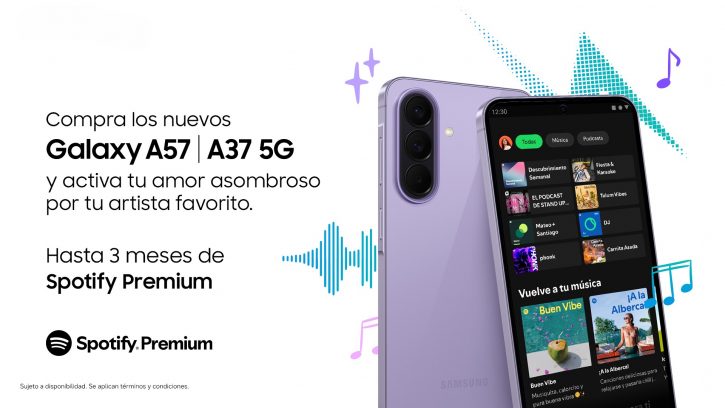 Samsung anunció una alianza con Spotify, la plataforma de streaming de audio más popular del mundo, para ofrecer en América Latina hasta tres meses de Spotify Premium a quienes adquieran los nuevos Galaxy A57, A37, A17 y A07. Con esta colaboración, la música se convierte en uno de los ejes de experiencia de la nueva serie Galaxy A.