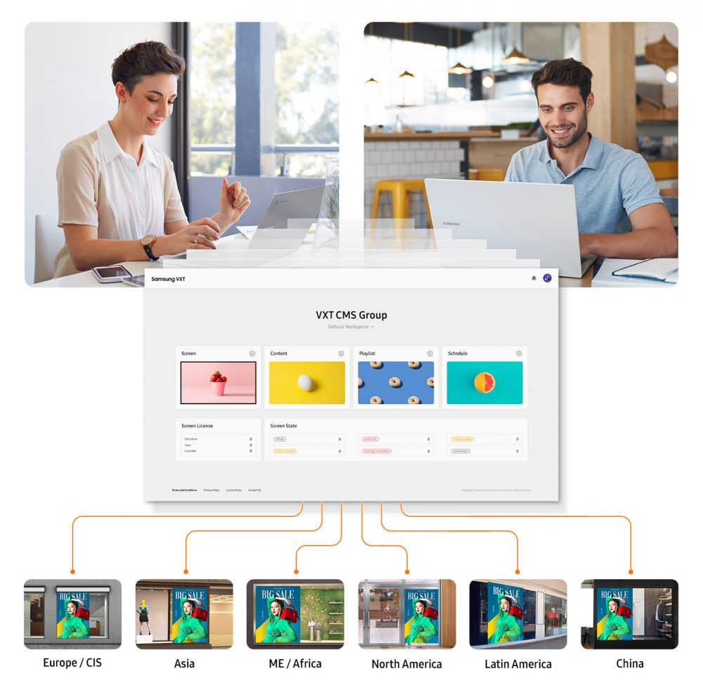 Pequeñas, medianas y grandes empresas pueden transformar la forma en la que gestionan su comunicación digital con la ayuda de Samsung Visual eXperience Transformation (VXT), una plataforma en la nube exclusiva de la marca que simplifica la creación y distribución de contenidos mediante el control remoto de dispositivos.