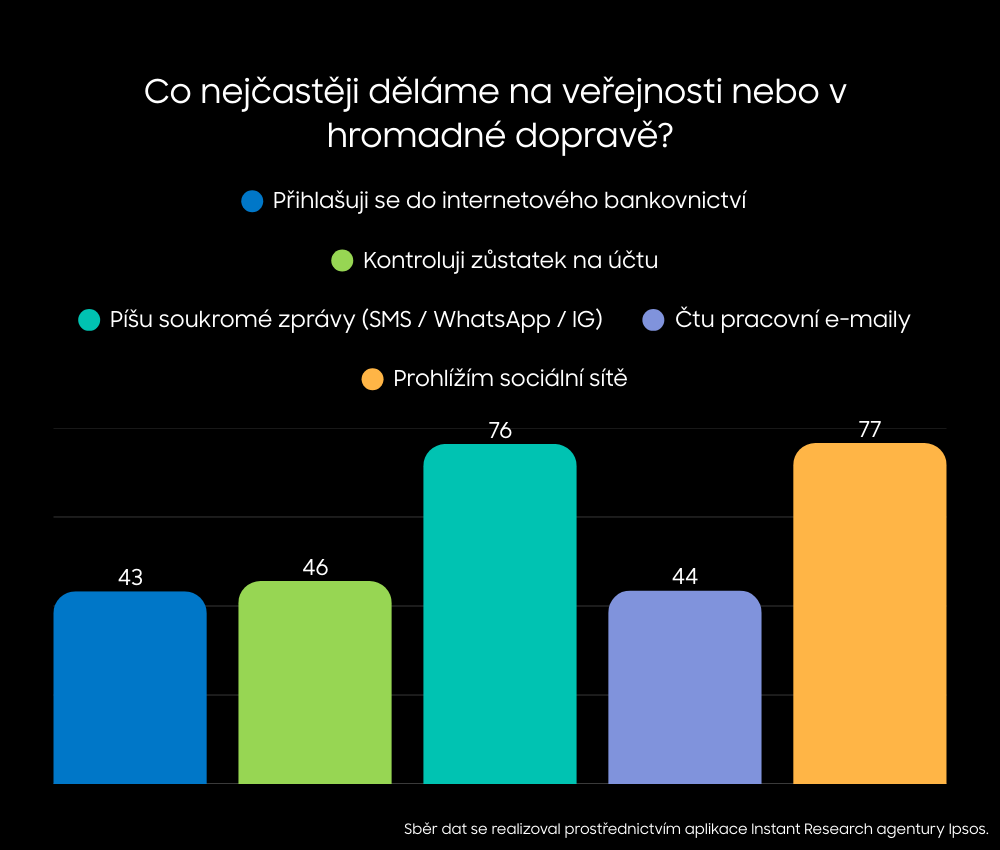 Soukromé zprávy jsou pak téměř samozřejmostí: 76 % lidí je píše i na veřejnosti a téměř třetina zadává hesla nebo přihlašovací údaje. Mobil už dávno není jen zdrojem zábavy, ale plnohodnotným osobním nástrojem pro každodenní život, ať už jsme kdekoliv.
