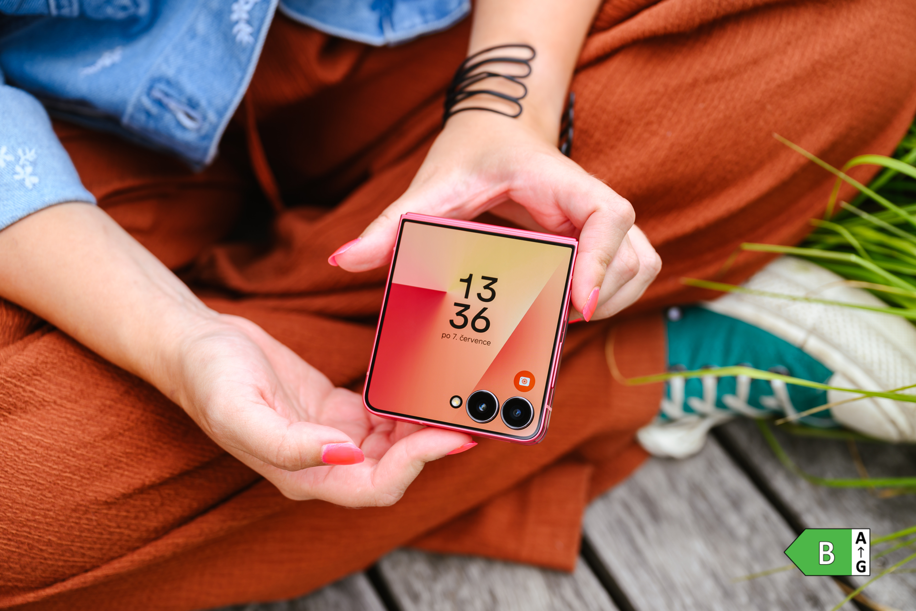 Galaxy Z Flip7 je designová AI skládačka do kapsy, která kombinuje kompaktní rozměry s nadupanou AI. Výrazné barevné provedení, například v romantické červené, podtrhuje osobitost a dává najevo, že technologie může být i stylovým doplňkem.