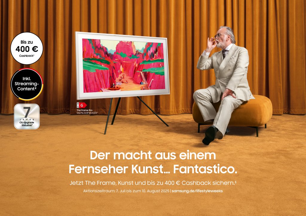 1 Nur für private Endkunden ab 18 Jahren beim Erwerb von neuen Samsung Aktionsgeräten mit bestimmtem länderspezifischem Modell-Code bei teilnehmenden Händlern in Deutschland oder im Samsung Online Shop unter samsung.com/de zwischen dem 7.7. und dem 10.8.2025 („Aktionszeitraum“). Kunden sind selbst dafür verantwortlich, dass die von ihnen erworbenen Geräte einen Modell-Code aufweisen, der zur Teilnahme an dieser Aktion berechtigt (für Details, Höhe des Cashback sowie Aktionsmodelle und Modell-Codes der Aktionsgeräte s. vollständige Teilnahmebedingungen). Beim Kauf eines neuen Samsung Aktionsgerätes erhalten Kunden einen modellabhängigen Cashback. Für den Erhalt des Cashback ist eine Registrierung der jeweiligen Aktionsgeräte bis spätestens 24.8.2025 (Ausschlussfrist) unter Angabe von Namen, Adresse, Kontoverbindung, E-Mail-Adresse sowie Seriennummer und Modell-Code plus Hochladen des Kassenbelegs (bei Erwerb im stationären Handel) bzw. der Bestellbestätigung und Rechnung (bei Erwerb im Online-Handel) sowie eines Fotos des Typenschildes, das auf dem jeweiligen Aktionsgerät angebracht ist (ein Foto des auf dem Karton angebrachten Schildes ist nicht ausreichend), unter samsung.de/lifestyleweeks erforderlich. Ein Nachreichen der für die Registrierung erforderlichen Angaben ist nicht möglich. Die Überweisung des Cashback erfolgt in der Regel innerhalb von 45 Werktagen nach gültiger Registrierung. Jeder Haushalt kann maximal mit jeweils zwei Aktionsgeräten pro Produktgruppe teilnehmen. Bei endgültiger Kaufrückabwicklung ist der Cashback zurückzuzahlen. Samsung behält sich eine vorzeitige Änderung und/oder vorzeitige Beendigung der Aktion vor, insbesondere wenn der Vorrat oder das Budget ausgeschöpft ist. Samsung behält sich außerdem eine Verlängerung der Aktion vor, insbesondere für den Fall, dass Aktionsinhalte (wie Aktionsmodelle) geändert werden. Nicht kombinierbar mit anderen Aktionen, Gutscheinen, Zuschüssen, Boni oder Rabattaktionen von Samsung, außer dies wird in den Teilnahmebedingungen der anderen Aktion ausdrücklich zugelassen. Davon ausgenommen ist die Aktion Samsung Made for Germany für ausgewählte Samsung Aktionsgeräte (Details, Umfang sowie Aktionsgeräte unter samsung.de/madeforgermany) sowie die Mix & Match Deals Aktion (Details unter samsung.de/mixmatch). Aktion im Einzelnen, Liste der Aktionsgeräte inkl. aller Cashbacks sowie vollständige Teilnahmebedingungen unter samsung.de/lifestyleweeks. Ausrichter: Samsung Electronics GmbH, Frankfurter Straße 2, 65760 Eschborn, Deutschland. 400 € Cashback beim Kauf eines The Frame Pro GQ85LS03FWUXZG. Der Cashback variiert je nach Aktionsgerät.