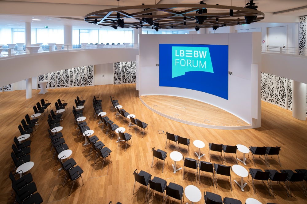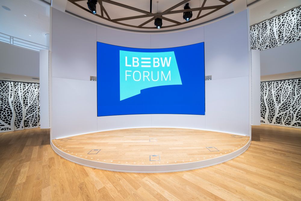 Die Landesbank Baden-Württemberg modernisiert ihren Stammsitz in Stuttgart. Rund 120.000 Quadratmeter Bürofläche werden so Schritt für Schritt für die Zukunft ausgestattet. Bereits fertig ist das LBBW-Forum. Im Mittelpunkt der Hightech-Veranstaltungsfläche steht eine LED-Wand, die aus den Viertel-Cabinets der IEA-F Serie von Samsung besteht. Das Besondere an der Installation ist zum einen das konkave Bild mit einer Auflösung jenseits von 4K, das perfekt mit Architektur, Akustik und Beleuchtung harmoniert. Zum anderen wurden die 168 Cabinets aus statischen Gründen auf einer speziellen Bodenkonstruktion befestigt.