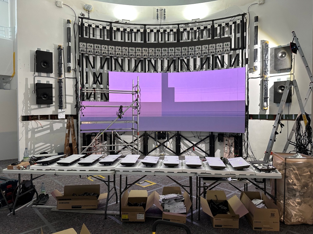 Die SEAMLESS Bespoke Unterkonstruktion sorgt dafür, dass das Gewicht der LEDs und der Halterungen nicht an der Wand, sondern auf dem Boden verteilt wird. Beides wiegt zusammen fast 2,5 Tonnen. Zugleich ermöglicht die präzise Spezialanfertigung eine perfekte Ausrichtung der Cabinets. So kann ein unterbrechungsfreies, gekrümmtes Bild entstehen, dass sich perfekt in den Raum integriert. „Wir arbeiten hier mit Toleranzen im 100tel-Zentimeterbereich“, sagt Michael Möller, Senior Sales Manager bei Peerless-AV. Eine Woche dauerte die Montage samt Feinjustierung. Der Aufwand hat sich gelohnt: „Wenn man den Raum betritt, stimmt einfach alles – Klang, Licht, Bild, Atmosphäre. Das ist enorm beeindruckend. Mich macht es stolz, dass ich einen Teil dazu beitragen durfte.“