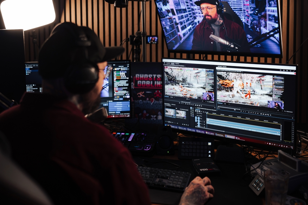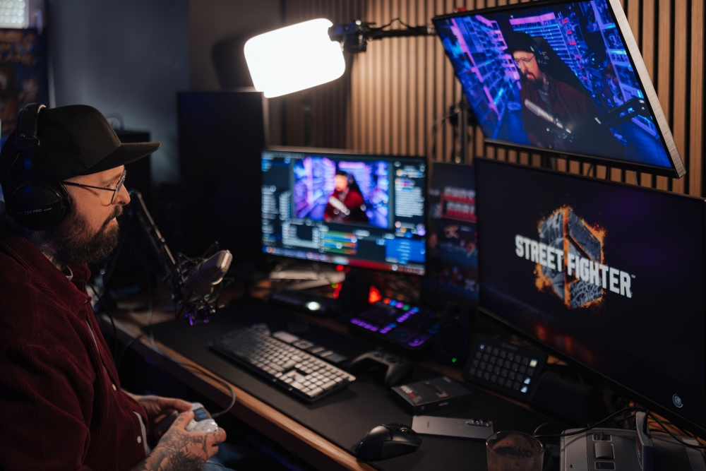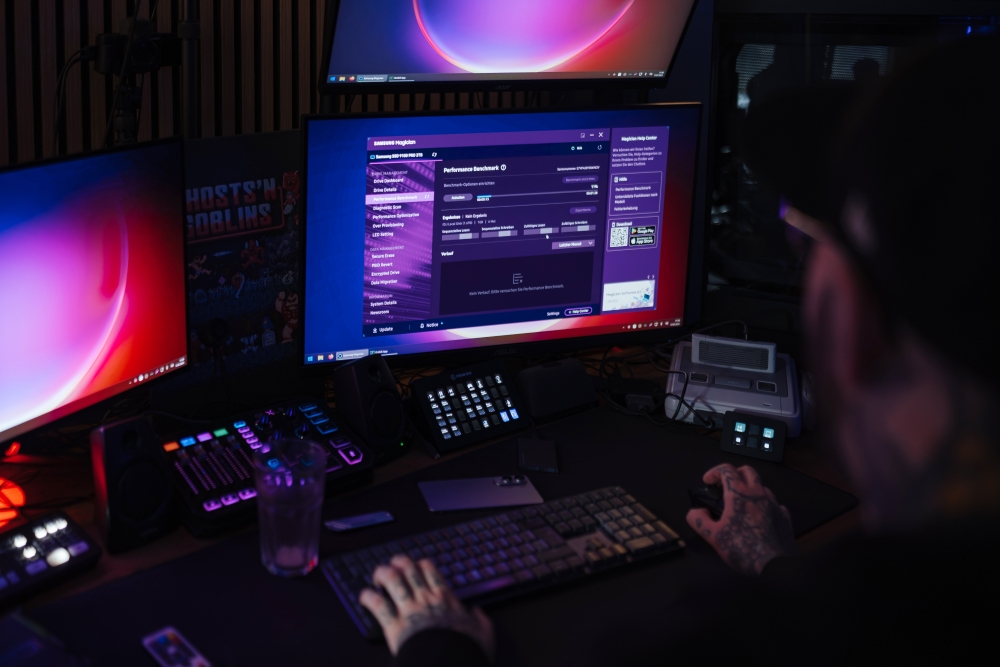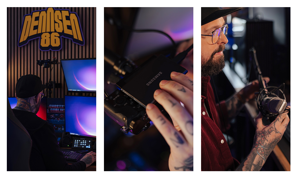 Ganz und gar nicht nostalgisch ist dagegen das technische Setup in dem Streaming-Raum. Neben der NVMeTM 9100 PRO von Samsung kommen weitere hochwertige Hardware Produkte zum Einsatz. Seine Streams nimmt Dennsen86 mit einem Richtmikrofon und einer digitalen Spiegelreflex auf. Daran kann er für direkte Backups eine PSSD T7 von Samsung an schließen. Mit USB 3.2 Gen 2-Support erreicht der externe Speicher Lesegeschwindigkeiten bis zu 1.050 MB/s und Schreibgeschwindigkeiten von bis zu 1.000 MB/s1. Damit können problemlos ProRes-Videoaufnahmen mit einer Bildwiederholrate von bis zu 60 fps (frames per second) in 4K-Qualität aufgezeichnet werden. Jede Menge Speicherplatz stellt die externe SSD obendrein zur Verfügung: Auf der 2 TB-Version finden 55 Stunden hochauflösendes Videomaterial Platz3.