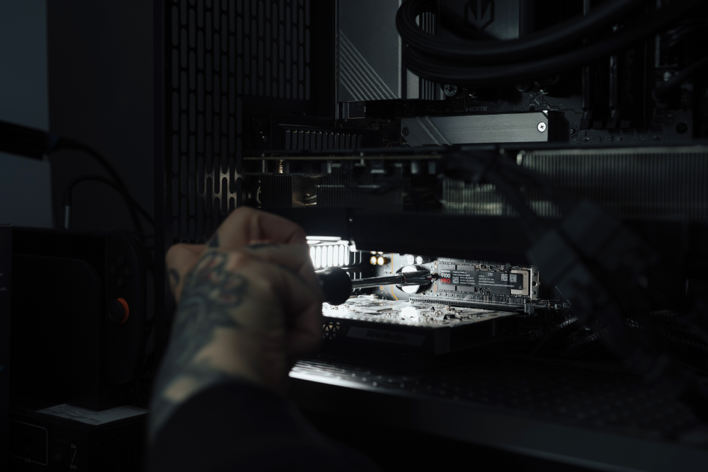 Umso wichtiger ist es, dass die Technik zuverlässig mit den Geschwindigkeiten mithalten kann. Dennsen86 setzt deswegen in seinem Setup auf die 9100 PRO von Samsung mit PCIe 5.0-Schnittstelle, V-NAND-Technologie der 8. Generation und intelligentem TurboWrite 2.0. Mit sequenziellen Lesegeschwindigkeiten von bis zu 14.800 MB/s und Schreibgeschwindigkeiten von bis zu 13.400 MB/s liefert die interne SSD die Leistung, die der Highspeed-Gamer für sein atemberaubendes Gameplay benötigt.1