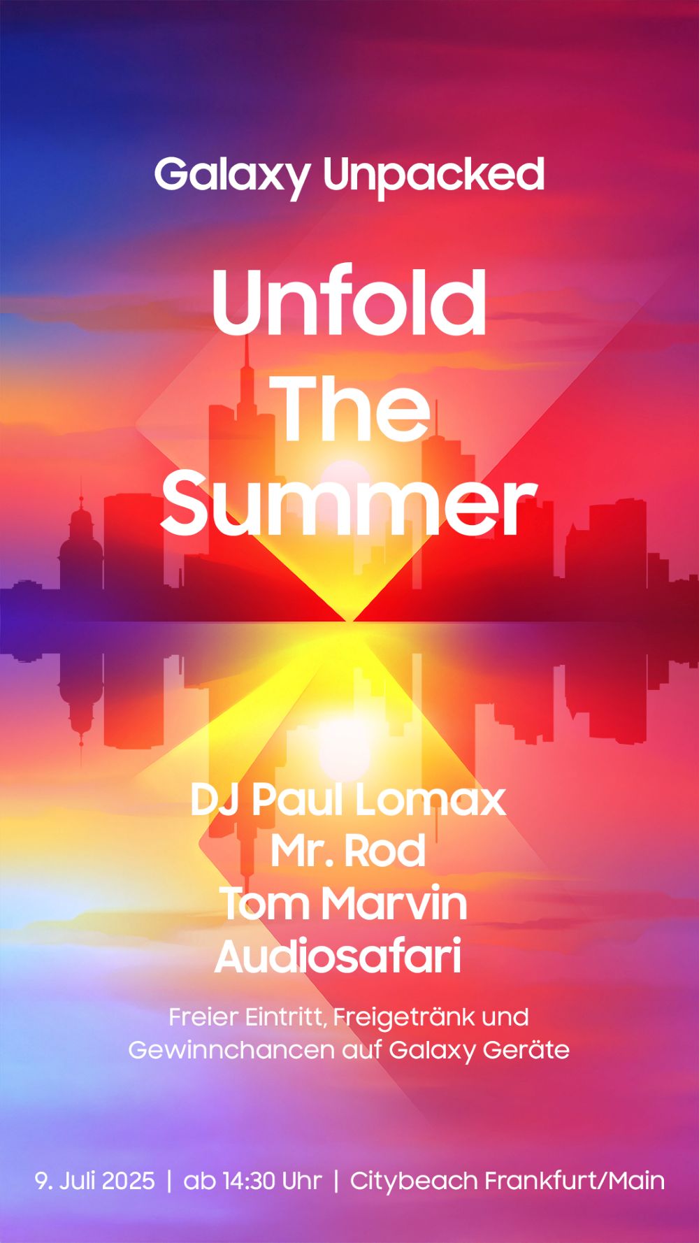 Der eisgekühlte Cocktail ist gemixt, die Wolkenkratzer glänzen in der Sonne und die neuesten Foldable Phones stehen in den Startlöchern. Am 9. Juli ab 14:30 Uhr können Besucher*innen des Citybeach in Frankfurt (Carl-Theodor-Reiffenstein-Platz 5, 60313 Frankfurt am Main) das „Samsung Galaxy Unpacked – Unfold The Summer“ erleben und ab 16 Uhr live die Vorstellung der neuesten Samsung Smartphones verfolgen.