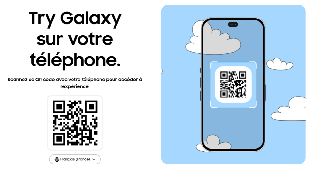 Try Galaxy est disponible sur les smartphones compatibles via le site officiel ou un code QR :