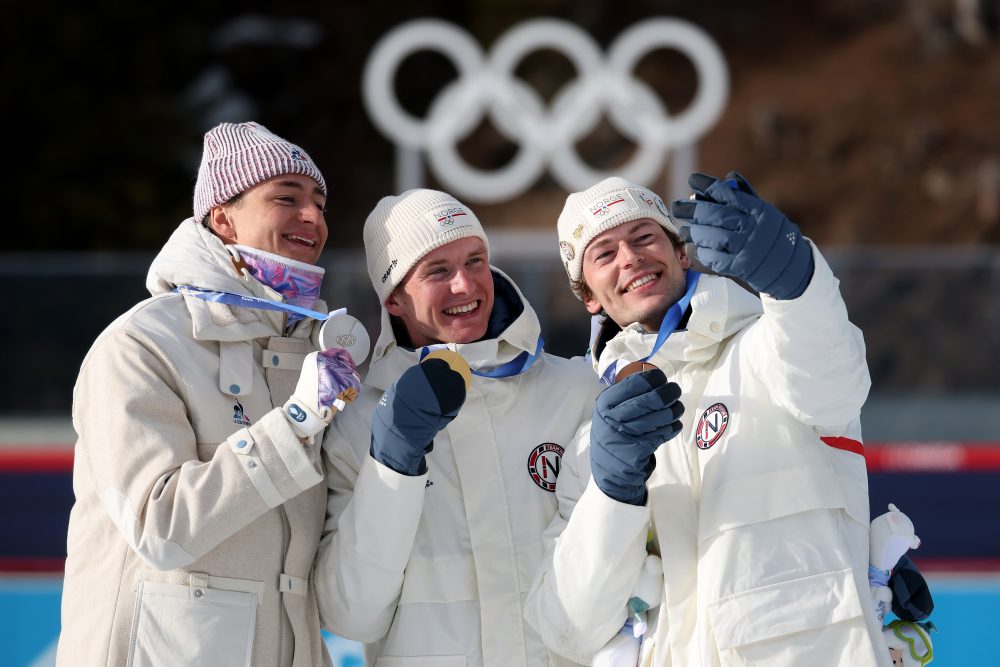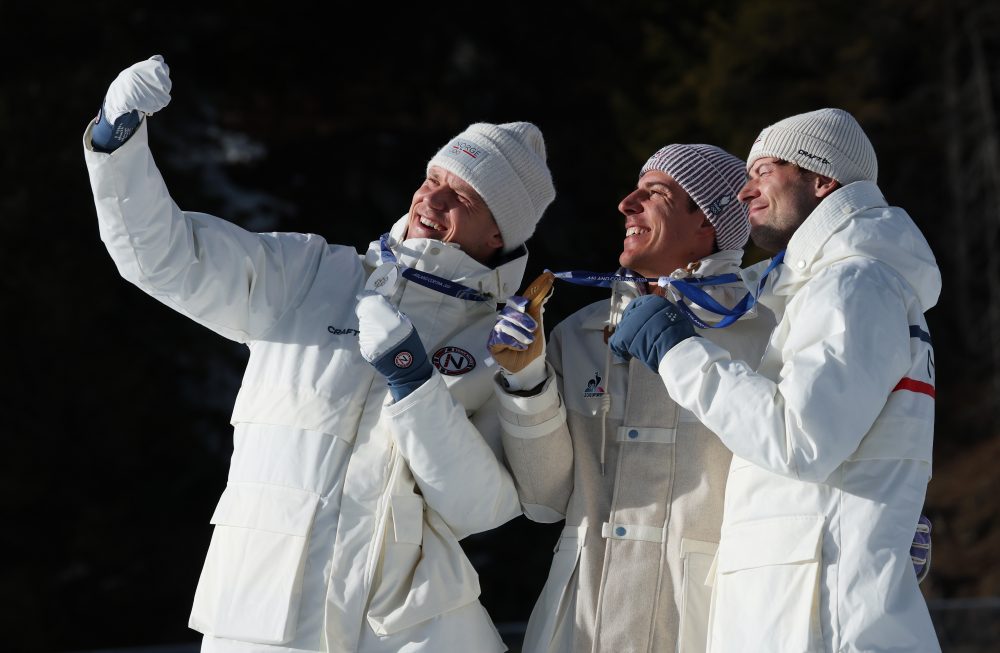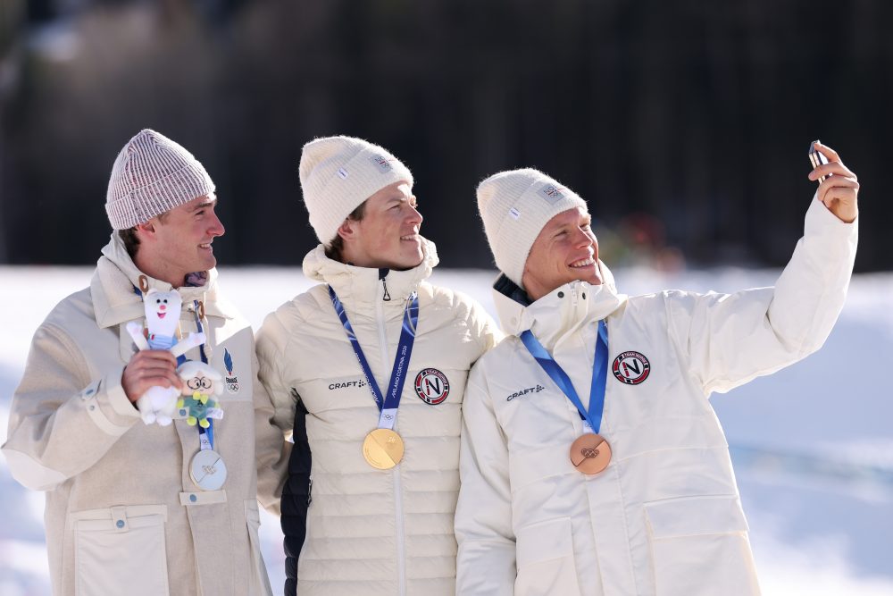 VAL DI FIEMME, ITALIE – 08 FÉVRIER : Le médaillé d’or Johannes Høsflot Klæbo de l’équipe de Norvège, le médaillé d’argent Mathis Desloges de l’équipe de France et le médaillé de bronze Martin Løwstrøm Nyenget de l’équipe de Norvège posent pour une photo en prenant un Selfie de Victoire lors de la cérémonie de remise des médailles du skiathlon masculin 10 km + 10 km, au deuxième jour des Jeux Olympiques d’Hiver de Milano Cortina 2026, au stade de ski de fond de Tesero, le 08 février 2026 à Val di Fiemme, en Italie. (Photo par Lars Baron/Getty Images)