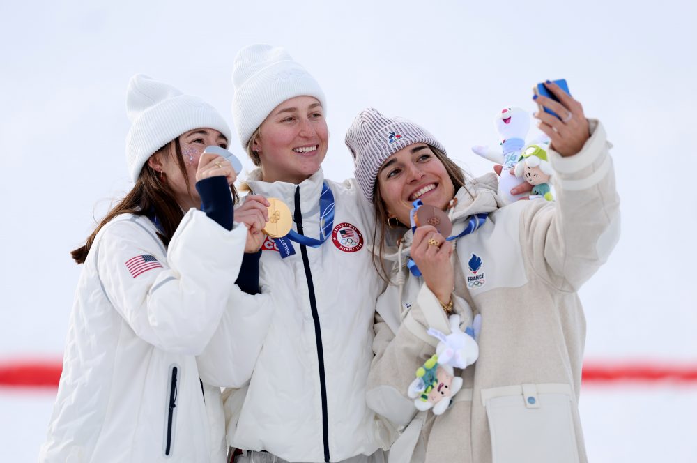 LIVIGNO, ITALIE – 11 FÉVRIER : La médaillée d’or Elizabeth Lemley de l’équipe des États-Unis, la médaillée d’argent Jaelin Kauf de l’équipe des États-Unis et la médaillée de bronze Perrine Laffont de l’équipe de France posent pour un Selfie de la Victoire lors de la cérémonie de remise des médailles du ski de bosses femmes lors de la cinquième journée des Jeux Olympiques d’Hiver de Milano Cortina 2026 au Livigno Air Park, le 11 février 2026 à Livigno, en Italie. (Photo par Michael Reaves/Getty Images).