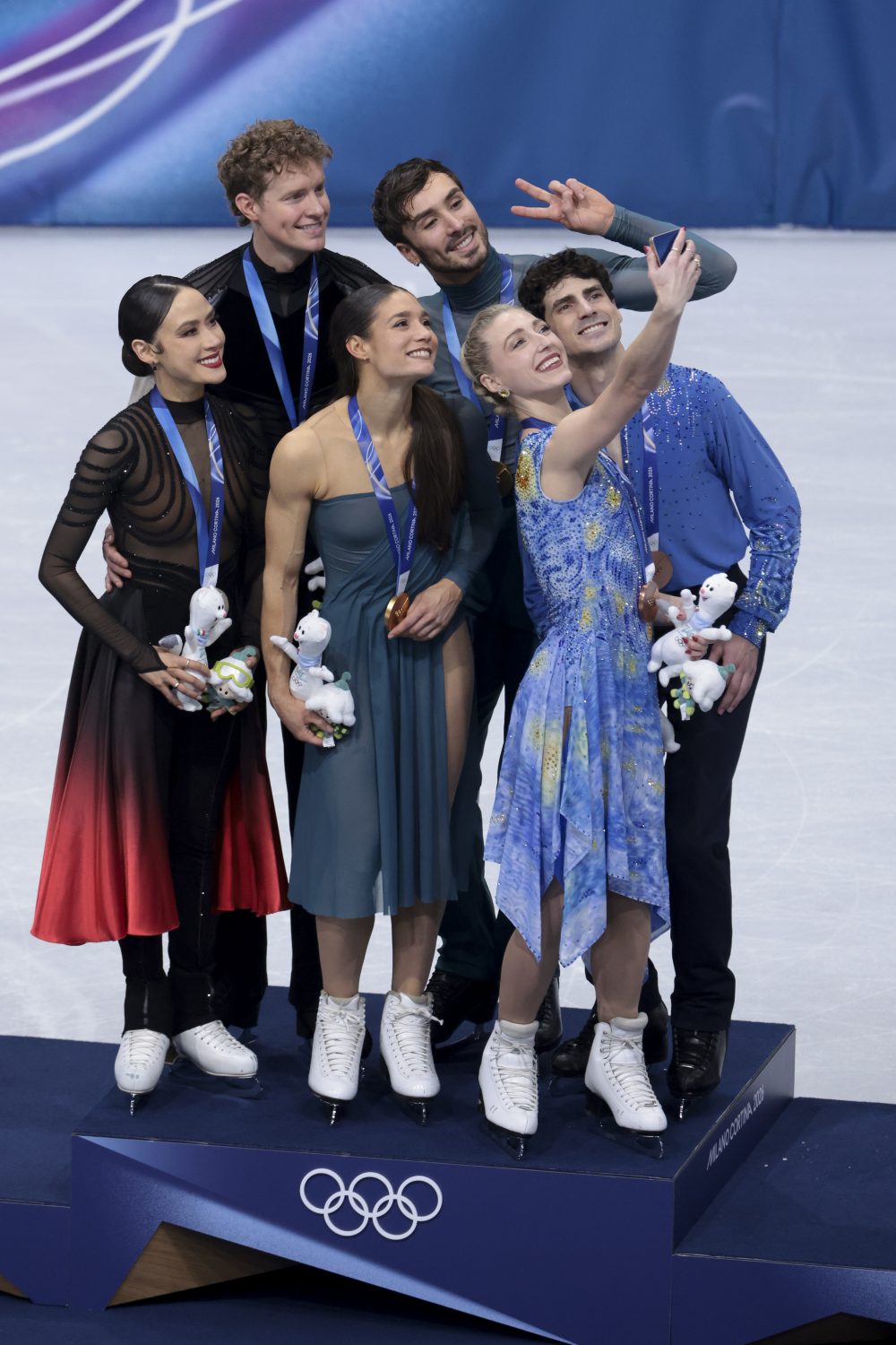 MILAN, ITALIE – 11 FÉVRIER : De gauche à droite, les médaillés d’argent Madison Chock et Evan Bates des États-Unis, les médaillés d’or Laurence Fournier Beaudry et Guillaume Cizeron de France, ainsi que les médaillés de bronze Piper Gilles et Paul Poirier du Canada réalisent un Selfie de la Victoire lors de la remise des médailles de l’épreuve de danse sur glace en patinage artistique, au cinquième jour des Jeux Olympiques d’Hiver de Milano Cortina 2026, à la Milano Ice Skating Arena, le 11 février 2026 à Milan, en Italie. (Photo par Jean Catuffe/Getty Images)