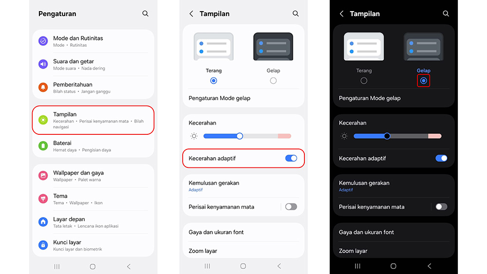 Mengatur kecerahan layar juga menjadi salah satu cara efektif untuk menghemat baterai. Pengguna dapat mengaktifkan Kecerahan Adaptif agar layar menyesuaikan kondisi cahaya sekitar secara otomatis, atau menggunakan Mode Gelap yang dapat mengurangi konsumsi daya. Cukup ke Pengaturan lalu ke Tampilan, pengguna dapat langsung mengatur Kecerahan Adaptif dan Mode Gelap.