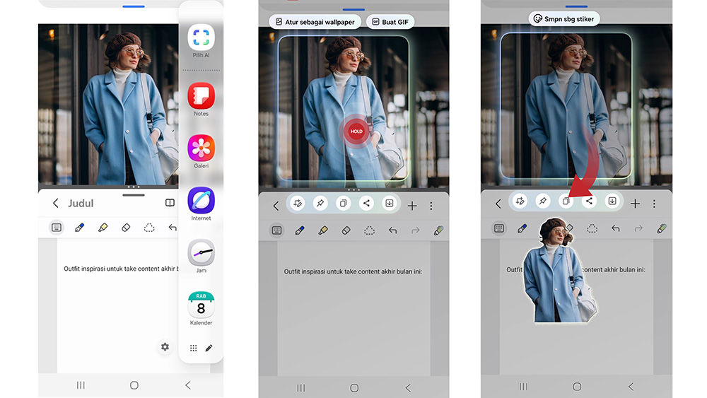 Saat mencari inspirasi konten, misalnya inspo pakaian, biar tidak lupa, kamu dapat memanfaatkan AI Select untuk mengambil gambar langsung dari konten yang dilihat, lalu Drag & Drop gambar tersebut ke moodboard-mu di Notes.