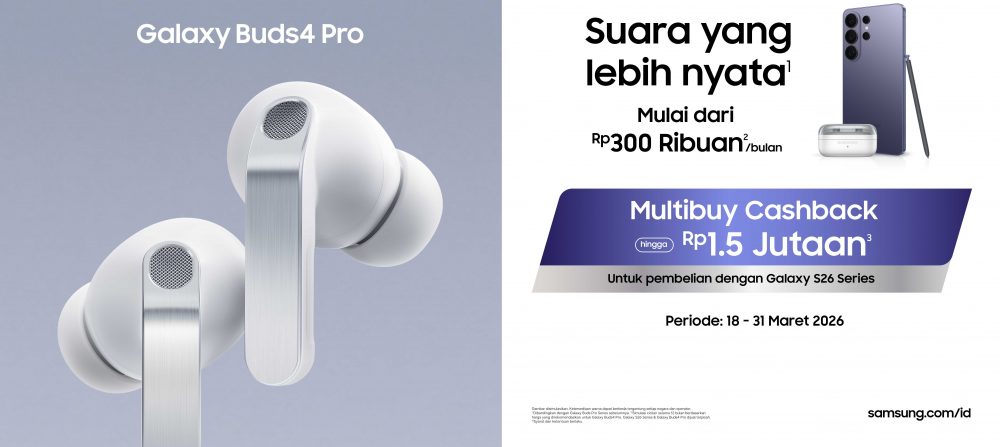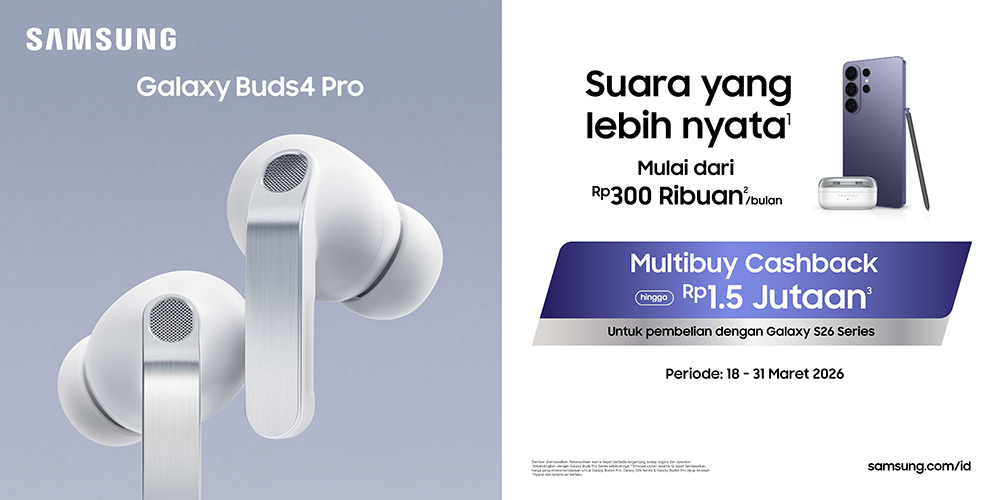 Untuk mendapatkan pengalaman audio terbaik dari Galaxy Buds4 Series konsumen bisa menikmati penawaran spesial berupa kemudahan cicilan mulai dari Rp300 ribuan per bulan untuk Galaxy Buds4 Pro atau mulai dari Rp200 ribuan per bulan untuk Galaxy Buds4. Nikmati juga multibuy cashback hingga Rp1,5 jutaan untuk setiap pembelian Galaxy Buds4 Series bersamaan dengan Galaxy S26 Series. Promo ini berlaku selama 18–31 Maret 2026.