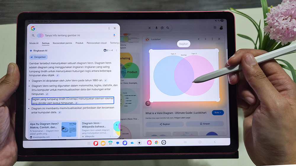 Kamu juga bisa mengandalkan fitur AI seperti Circle to Search untuk memperkaya proses pengembangan ide dan inspirasi kamu. Cukup lingkari teks atau gambar pakai S Pen, kamu bisa menemukan informasi-informasi berharga tak peduli apapun bahasanya, sebab fitur ini juga bisa langsung membantu menerjemahkan.
