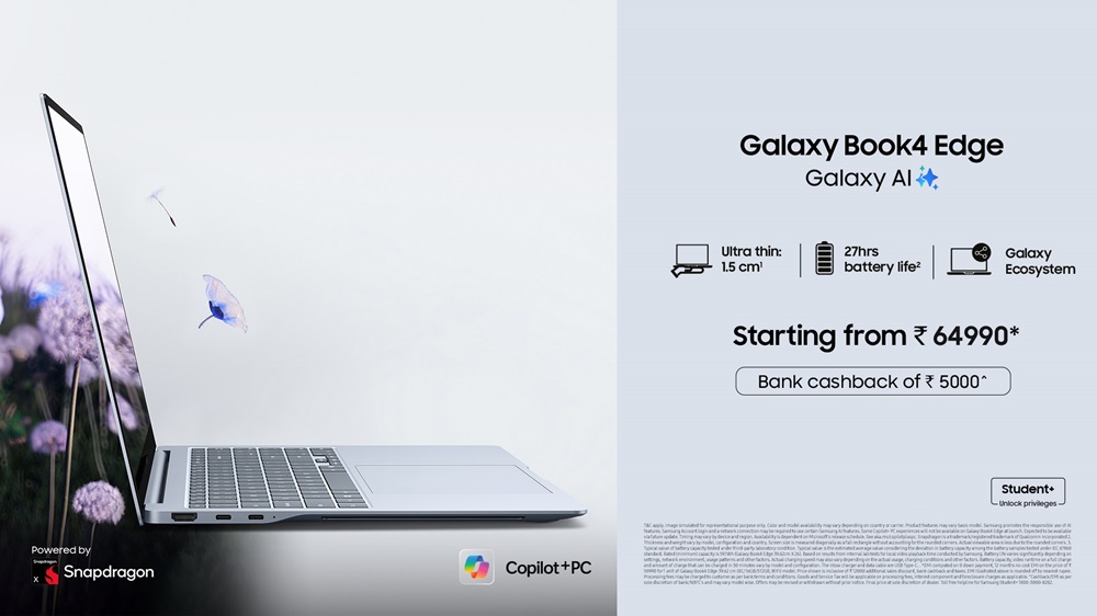Starting today, the Galaxy Book4 Edge will be available at an introductory price of INR 59990*, with INR 5,000 cashback offer on major banks. Galaxy Book4 Edge will be available on www.samsung.com, Flipkart.com, Samsung Shop App, Samsung Experience Stores and select retail outlets across the country. Galaxy Book4 Edge comes in 15-inch size with an enhanced refined finish for a sleek, premium feel, created from a wide variety of recycled materials, including plastics, glass and aluminum. It also features a 1080p HD camera and Wi-Fi 7 connectivity.