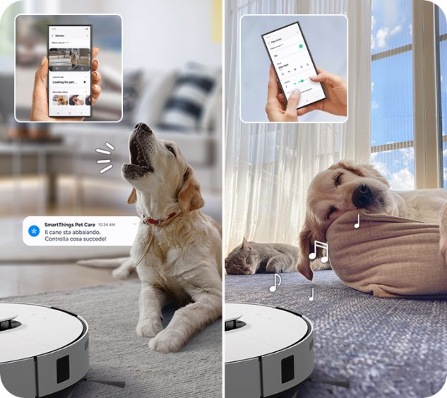 Infine, con il servizio SmartThings Pet Care, si ricevono notifiche se il cane abbaia, ed è possibile tenergli compagnia facendogli ascoltare della musica.