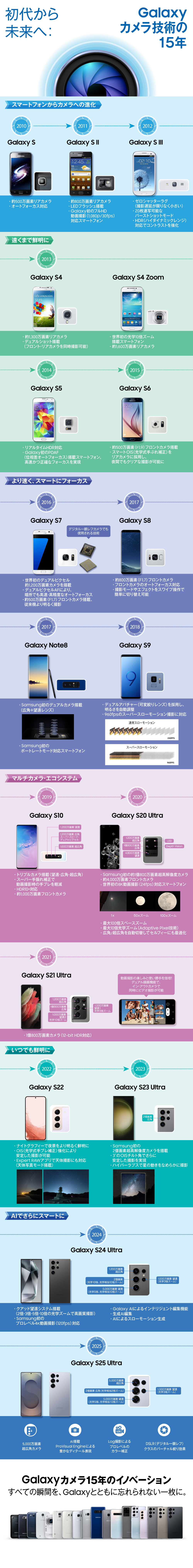 サムスン電子(韓国本社、以下、Samsung)は、スマートフォンが登場する前から、モバイルのカメラ性能と技術において数々の“初めて”を実現してきました。2010年に登場した「GALAXY S」に搭載された500万画素カメラから、最新の「Samsung Galaxy S25 Ultra」に搭載された2億画素の超高解像度カメラ、5,000万画素の超広角カメラ、そしてGalaxy AIによるスマートな編集機能まで、Samsungは常にスマートフォンカメラの可能性を切り開いてきました。